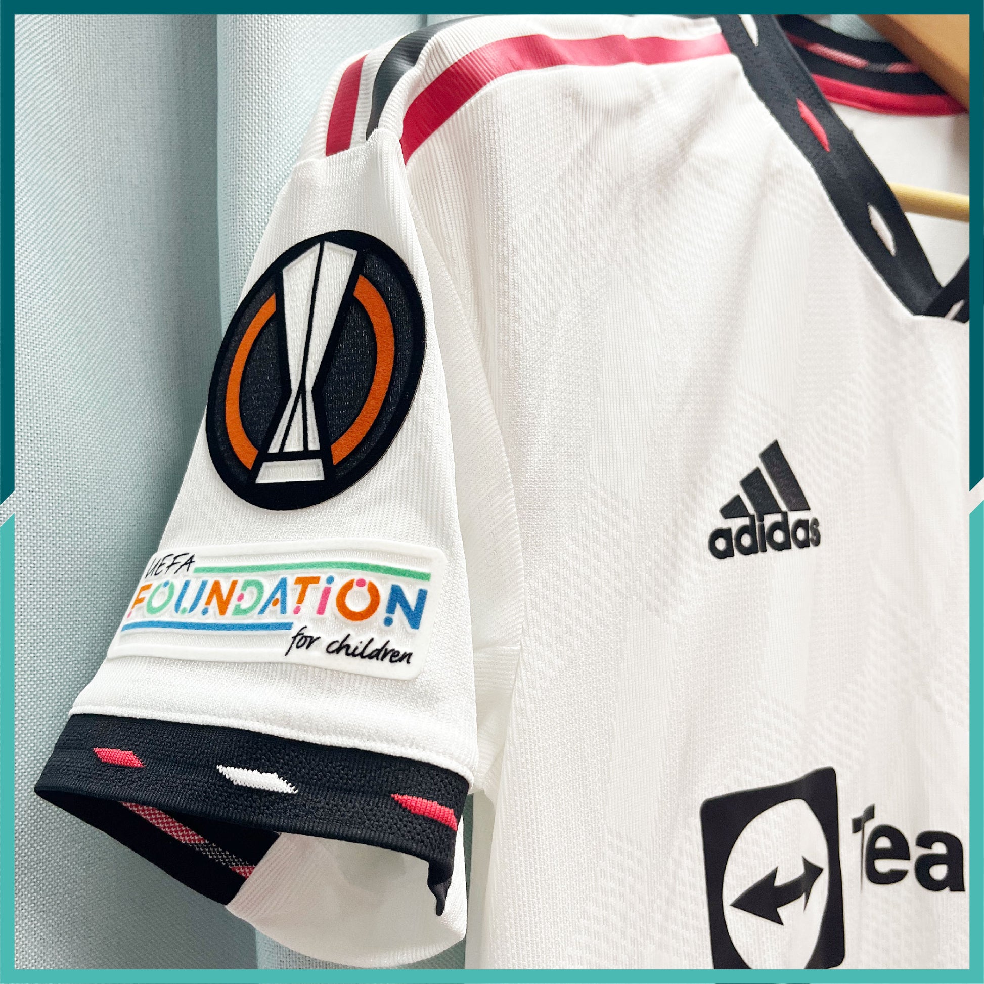 球員落場版本胸前廣告、手臂廣告 連歐霸盃臂章、UEFA Foundation For Children 臂章 |